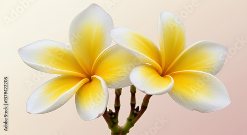 © Grosir, Obraz premium Two Radiant Yellow And White Plumeria Flowers Isolated On Soft Gradient Background