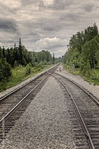 Fototapeta premium Two railtracks become one in the alaskan wilderness. Concept of merging together
