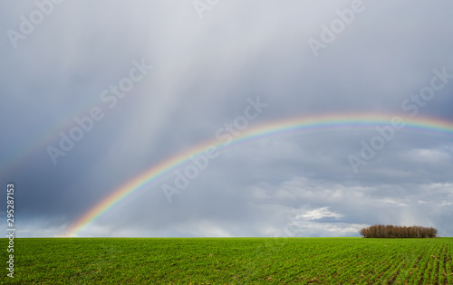 © Mykola Mazuryk, Naklejka premium two rainbows over green agriculture field