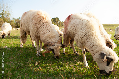 © Egor, Obraz premium Two rams with large horns graze peacefully in a lush green pasture with other sheep.