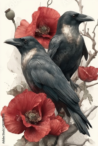 © Georgii, Obraz premium Two ravens perched on vivid red poppies in a botanical watercolor illustration with soft tones and branches