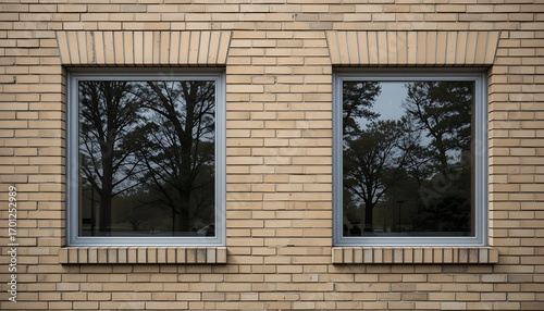 Fototapeta premium Two rectangular windows reflect trees in a tan brick wall, capturing stark...