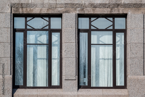 Fototapeta premium Two rectangular windows with brown frames against a wall of grey blocks. From...