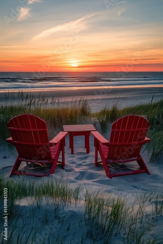 © Mood, Fototapeta premium Two red beach chairs on the sand at sunset