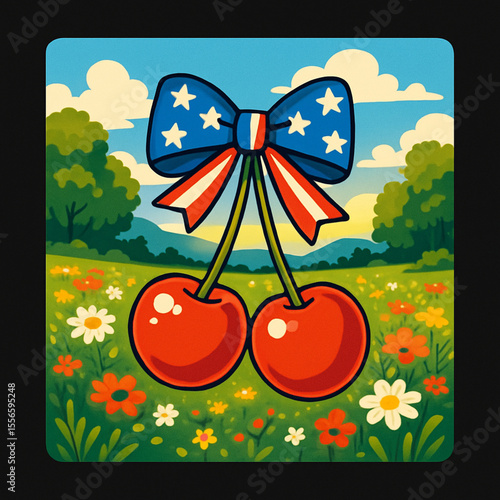 © Mohammed, Fototapeta premium Two Red Cherries, American Flag, Landscape Background