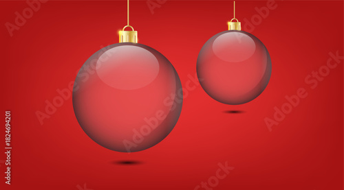 © Shahadat, Fototapeta premium Two red Christmas ornaments hanging on a red background