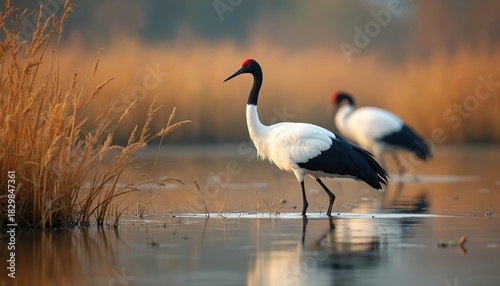 © Viktor, Obraz premium Two red-crowned cranes stand in calm water. Birds look for food in wetland area. Crane couple rests in wild environment. Habitat provides shelter and resources for many species.