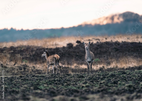 Naklejka premium Two red deer doe in moorland at sunset. National Park Hoge Veluwe.