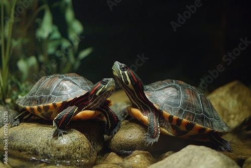Obraz premium Two red-eared slider turtles resting on rocks in a pond