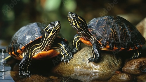 Obraz premium Two red-eared slider turtles resting on rocks in a pond