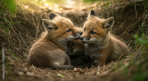 © ASTERISKS, Naklejka premium Two Red Fox Kits Huddle Together in Their Burrow