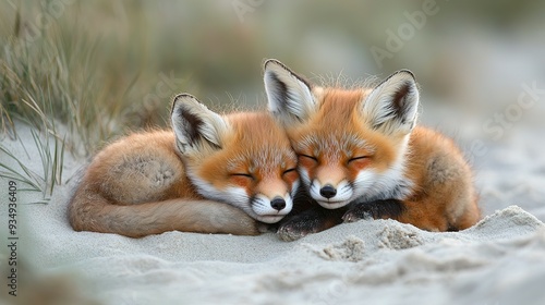 © Helens, Obraz premium Two Red Fox Kits Huddled Together Sleeping in Sand