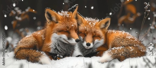 Obraz premium Two Red Foxes Huddle Together in the Snow