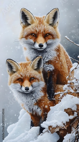 Fototapeta premium Two red foxes in a snowy landscape, showcasing their vibrant fur and playful...