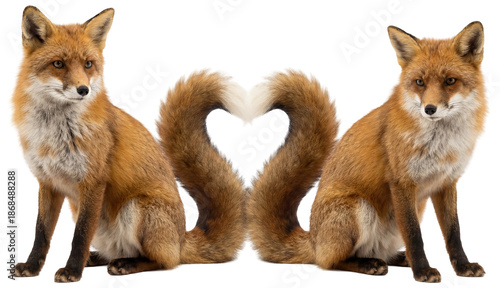 © Flowal93, Fototapeta premium two red foxes sitting back to back with tails forming a heart isolated on a transparent background