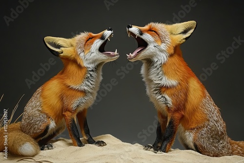 © Hungarian, Fototapeta premium Two Red Foxes Yawning Face To Face In Sand