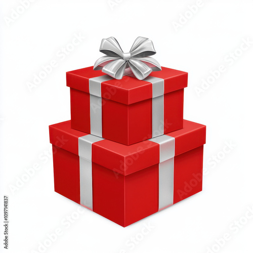 Fototapeta premium Two red gift boxes with silver ribbon and bow stacked on top of each other on a white background