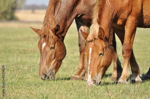 © Kateryna Kalynovska, Fototapeta premium Two red horses of heavy draft breed graze in the pasture