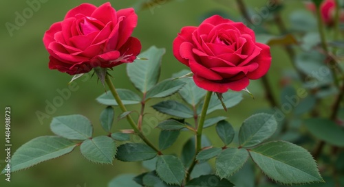 © mdshafiq, Naklejka premium Two red roses representing love and beauty, featuring green leaves and a blurred background