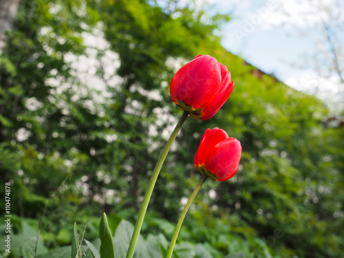 Obraz premium Two red tulip in a green field. The sky is blue.