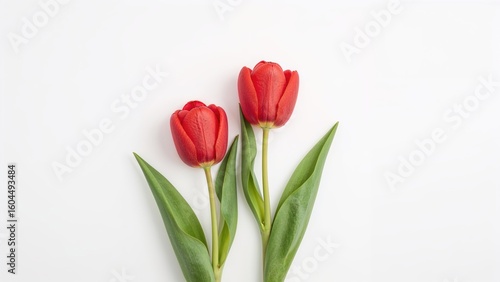 © AkuAku, Fototapeta premium Two red tulips with green leaves isolated on white background arranged in a top view flat lay composition with ample copy space.