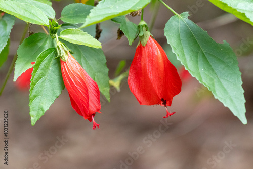Obraz premium Two red Turk's Cap flowers (Malvaviscus arboreus) in horizontal close-up....