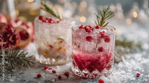 Naklejka premium Two refreshing cocktails featuring pomegranate and rosemary are presented in stylish glasses. The drinks are set on a winter themed table surrounded by decorative snow and shimmering lights.