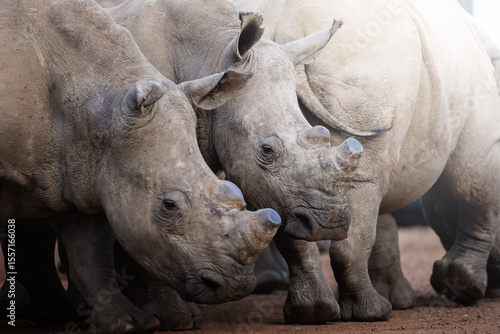 Naklejka premium Two rhinos engage in a forceful dominance display, pushing and shoving each...
