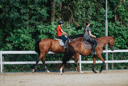 Obraz premium Two riders enjoy horseback riding in an outdoor arena. The scene is framed by...