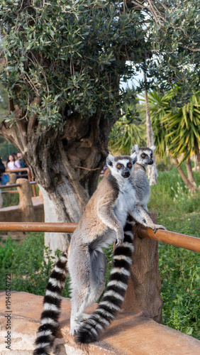 Obraz premium Two ring-tailed lemurs standing on a wooden railing in a tropical park.