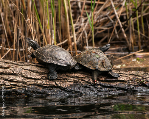 © Erkan, Obraz premium Two river turtle resting on a fallen tree