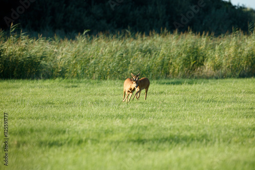 © otterspeer.com Stock, Naklejka premium Two roe deer graze in a grassy field, with tall grasses in the background. A peaceful rural scene.