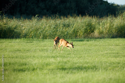 Fototapeta premium Two roe deer graze in a grassy field, with tall grasses in the background. Peaceful rural scene.