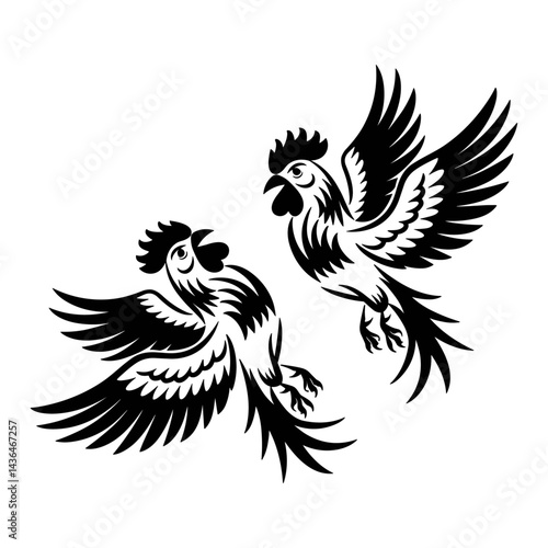 © Creative World, Obraz premium Two roosters fighting, vector black illustration.