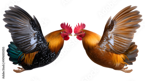 © Usama, Obraz premium Two roosters in a dramatic mid-jump fight, feathers flying, isolated on transparent background