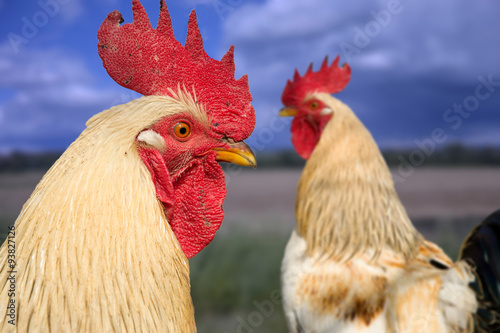 Fototapeta premium Two roosters on rural farm yard, Close up of rooster head