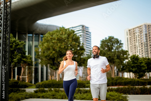 © BGStock72, Naklejka premium Two runners enjoying an active morning in a vibrant urban park setting