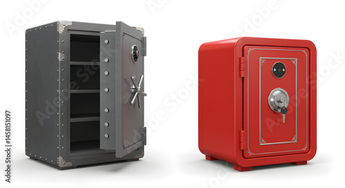 © abu, Obraz premium Two Safes Gray with Open Door and Empty Shelves Red Safe Standing on White Surface for Security and Storage