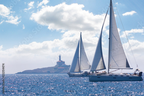 © Milan Noga reco, Obraz premium two sailing ships near a lighthouse in summer day, Croatia
