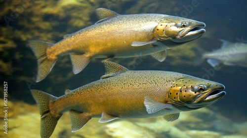 Naklejka premium Two salmon swimming in clear water, rocky riverbed background; for nature,...