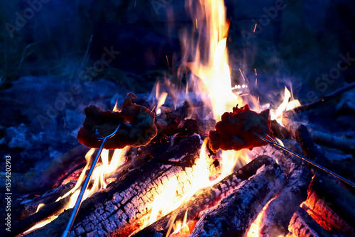 Fototapeta premium Two schnitzels roasting over an open campfire at night. Flames and glowing logs create a cozy outdoor cooking scene in the wild.