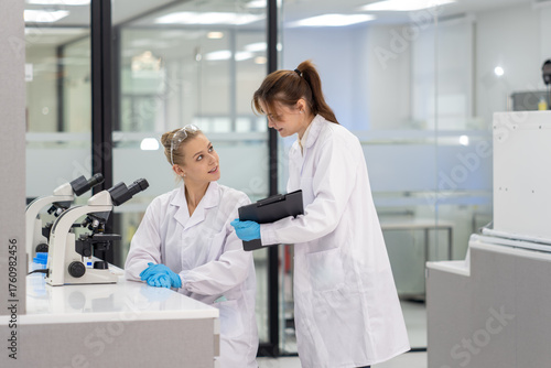 © Freeday photo, Obraz premium Two scientists collaborate in a modern laboratory while discussing research findings during a sunny afternoon