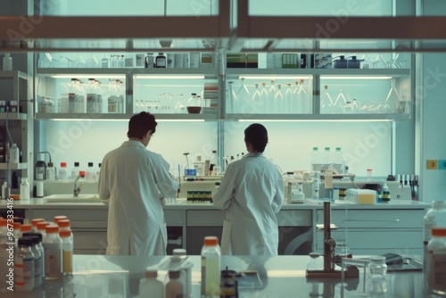 © Victor Bertrand, Obraz premium Two scientists work diligently in a highly equipped laboratory, highlighting collaboration and scientific pursuit in a controlled environment.