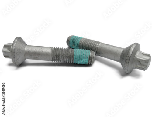 © Thanakorn, Fototapeta premium Two screws, encapsulation in blue glue at the end of the screw thread, are placed on a white background.