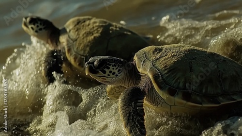 © Rapit, Obraz premium Two sea turtles emerge from the ocean surf with sand on their shells