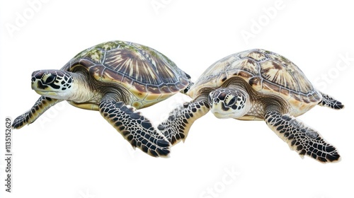 Naklejka premium Two sea turtles swimming gracefully in a clear background.