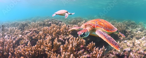 Fototapeta premium Two sea turtles swimming near a coral reef in the ocean