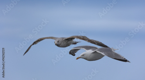 © Jonas, Obraz premium Two seagulls flying over calm sea