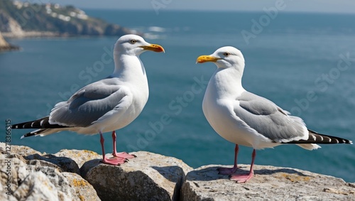 © The 2R Artificiality, Fototapeta premium Two Seagulls Sitting on Coastal Rocks Overlooking the Ocean with Clear Blue Sky and Space for Text Overlay