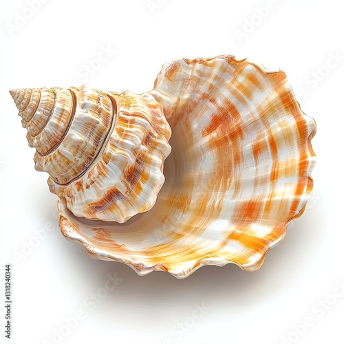 Obraz premium Two seashells, one spiral, one open, on white background.
